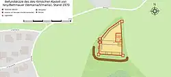Die Festungsanlage wurde in mehreren Bauphasen errichtet, der jüngste Umbau hat wahrscheinlich in valentinianischer Zeit stattgefunden. Der Grundriss, ein unregelmäßiges Fünfeck, folgt exakt den Konturen des Moränenhügels. Insgesamt konnten sechs Bauphasen voneinander unterschieden werden. Eine erste – wohl zunächst nur provisorische – Befestigung entstand um 260 n. Chr. Sie beschränkte sich in ihrer Fläche auf den Nordteil des zuvor einplanierten Plateaus. Vom frühen Kastell konnte nur im Norden ein fünf Meter breiter und 1,7 m tiefer Graben (Spitzgraben A) nachgewiesen werden. In den späteren Bauphasen bzw. zur Vergrößerung des Kastells musste die Plateaufläche von den römischen Ingenieuren durch Aufschüttungen erweitert werden. Die fast nur noch durch ihre Fundamentgräben nachweisbare Umfassungsmauer (Breite 1–1,80 m) maß im Osten 88 m und war zusätzlich mit drei Eck- und zwei Zwischentürmen verstärkt worden. Sie war bis zu einem Meter breit. Das Kastell war nur im Nordwesten durch ein Tor, mit einer Durchfahrt, zugänglich. Es war von zwei weit vorkragenden Hufeisentürmen, mit je einem Durchmesser von vier Metern, flankiert. An West- und Südseite wurde ein zwölf Meter breiter und drei Meter tiefer Wehrgraben (Spitzgraben B) angelegt, der heute noch sichtbar ist. Er trennte das Plateau von dem leicht nach Westen abfallenden Vorland. Zwischen Kastellmauer und Graben lag eine sechs bis sieben Meter breite Berme.[5]