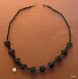 - ↑ Material/Technik: Kollier: Glasperlen, profilierte Goldblechzylinder; Fuchsschwanzkette mit Amulettkapsel: Gold; Halskette: Gagat, Glasflussperlen; Ohrringe: Goldblech, Goldraht, Lapis; Münzen: Bronze, Silberüberzug. Maße: Kollier: L 40 cm; Fuchsschwanzkette: L 44 cm; Kapsel: L 5,2 cm; Ohrringe: H 1,3 cm, B 1,4 cm, hergestellt vermutlich 3.–4. Jahrhundert n. Chr.