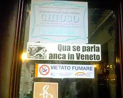 - ↑ «Tutela, valorizzazione e promozione del patrimonio linguistico e culturale veneto ». Regionalgesetz vom 13. April 2007, Nr. 8, verabschiedet am 28. März 2007 vom Consiglio regionale del Veneto a larghissima maggioranza; zit. n.: Camera dei Deputati: Atti Parlamentari, XVI legislatura, Disegni di legge e relazioni, Documenti, N. 5246. S. 2, Sp. 1 (camera.it [PDF; 141 kB, abgerufen am 3. Dezember 2016]).