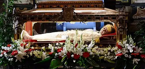 Sie bekam ein sanftes Gesicht mit geschlossenen Augen und wurde wieder in „ihre“ Kirche gebracht, wo sie unter dem Hochaltar ihren Platz fand.[16]