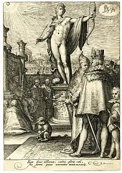 Während aber beispielsweise die Darstellung des Walfangs auf einem Teil des Beutetiers als Trophäe einen inhaltlichen Zusammenhang zwischen Gegenstand und Material des Kunstwerks erkennen lässt, muss der Künstler des Pollinger Bildes sich an ganz andere Vorgaben gehalten haben: Ein Blatt von Jan Saenredam[5] nach Hendrick Goltzius aus dem Jahr 1596 zeigt frappierenderweise genau die Hauptgruppe der venezianischen Hafenszene: Apollo, eindeutig dem Apollo von Belvedere nachgebildet, steht auf seinem Sockel, ebenso sind der degentragende Pantalone und, in etwas anderer Gestalt und Anordnung, die vielleicht mit ihm disputierenden Gestalten, die auf dem Walschulterblatt zu erkennen sind, vorhanden. Die lässige Körperhaltung des thronenden Königs hat in der venezianischen Szene der dunkelhäutige Sitzende übernommen. Die Umgebung der Szene ist freilich eine andere; einen gewissen Zusammenhang mit Venedig könnte bei Saenredam jedoch der Löwe rechts oben im Bild herstellen, wenn er auch hier aus astronomischen Gründen beigefügt ist.[6]