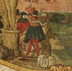 Im Vordergrund des Bildes befindet sich auf der linken Seite eine Art Schiffsanlegestelle, auf der eine etwas überlebensgroße Apollostatue mit Pfeil und Bogen steht, die von mehreren Menschen umgeben ist. Unter diesen ist ein rotbehoster Mann mit Degen, Halskrause, Pelzkragen, schwarzem Umhang und schwarzer Kappe besonders hervorgehoben, der zu Füßen der Statue im Profil von links zu sehen ist. Diese Tracht war im Spanien des frühen 17. Jahrhunderts modern, was ebenfalls für die früher angenommene Datierung auf 1606 spricht. Zu seinen Füßen liegen etliche Warenballen, auf denen sich das Zeichen aus der Kartusche über dem Bild wiederholt und die Zahlen 100 und 1000 zu erkennen sind. Links der Statue, diesem Mann zugewandt und die Füße auf weiteren Warenballen, sitzt eine dunkelhäutige Menschengestalt, weiter hinten befinden sich noch mehrere, teils halb verdeckte Figuren. Eine davon trägt eine weiße Maske.