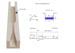 Bei Abwasser-Durchflussmessung wird der Venturi-Kanal nach und nach durch magnetisch-induktive Durchflussmesser ersetzt. Einzelheiten siehe auch: DIN 19 559.[1] Er besitzt aber immer noch Vorteile wegen der Zugänglichkeit und Überprüfbarkeit der Messstrecke sowie der guten Überprüfbarkeit der Systemkomponenten. Wenn im Oberwasser des Venturi-Kanals ein Höhenfestpunkt angelegt wurde, kann z. B. der Durchfluss jederzeit mit einem Meterstab und der Abflusskurve gemessen werden.
