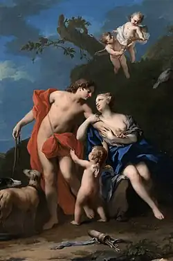 In den folgenden drei Szenen entfaltet sich – diesmal im erhabenen Stil – die eigentliche Handlung auf der Bühne. Die Liebesgöttin Venus tritt mit Nymphen und Satyrn im Gefolge auf. Die Nymphen besingen die Göttin, die ihnen von ihrer unglücklichen Liebe zum sterblichen Jüngling Adonis erzählt, für den sie die Göttersphäre verlassen hat, obwohl er ihr Verlangen nicht erwidert. Sie weist ihren Sohn Cupido an, ihn in Liebesbande zu verstricken und mit seinem Pfeil zu treffen, auf dass er ihr gewogen werde. Cupido verspricht es ihr und der Vorhang schließt sich wieder.