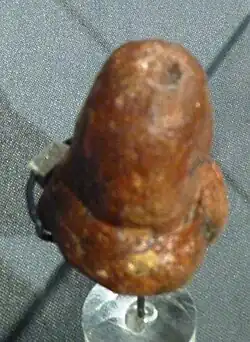 Die 7,2 cm hohe Figur besteht aus mergeligem Kalkstein und ist mit roter Farbe eingefärbt.[2] Die Form ist ambivalent interpretierbar: Einerseits lässt sie sich als stark stilisierte Darstellung einer Frau mit betontem Gesäß lesen, andererseits als phallisches Symbol mit angedeuteten Hoden.[3] An der Oberseite ist eine Vertiefung eingearbeitet, die als Darstellung des Urinkanals interpretiert werden kann. Diese Art der doppelgeschlechtlichen Darstellung findet sich bei mehreren jungpaläolithischen Statuetten, darunter Figurinen von den Fundorten Dolni Vestonice, Gönnersdorf, Nebra, Mezin, Milandes, Oelknitz, Savignano, Trasimeno und Trou Magrite. Eine kleine Vertiefung an der Oberseite wird als mögliche Darstellung eines Urinkanals interpretiert.