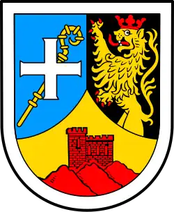 Die Wappenbeschreibung lautet: „In silbernem Schildbord durch eine eingepfropfte goldene Spitze von Blau und Schwarz gespalten, oben rechts ein schräglinks gerichteter goldener Krummstab, belegt mit einem schwebenden silbernen Kreuz, oben links ein wachsender rotbewehrter, -bezungter und -bekrönter goldener Löwe, unten auf rotem Dreifels eine ebenfalls rote Burg.“