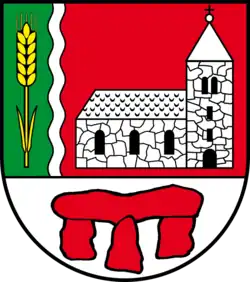 Blasonierung: „In Rot mit von einem silbernen Wellenstab gesäumter rechter grüner Wellenflanke eine natürlich gefügte silberne Feldsteinkirche mit schindelbedachten Kirchenschiff und drei schwarzen Rundbogenfenstern, hinten der spitzbedachte und beknaufte Kirchturm mit Kreuz, zwei Rundbogen- und zwei gemeinen schwarzen Fenstern (2:1:1) und schwarzem Rundbügenportal; die Flanke belegt mit goldener Ähre mit Grannen und zwei Halmblättern; im erhöhten silbernen Schildfuß ein rotes Großsteingrab. Die Hauptfarben des Wappens sind - abgeleitet vom Hauptwappenmotiv und der Schildfarbe - Silber (Weiß)/Rot.“
