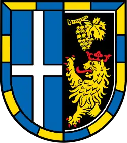 Blasonierung: „In sechzehnfache von Gold und Blau geteiltem Schildbord von Blau und Schwarz gehalten, rechts ein silbernes Kreuz, links ein wachsender rotbewehrter und -bekrönter goldener Löwe, darüber eine goldene Weintraube mit goldenem Blatt.“[12] |