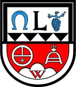 Die Wappenbeschreibung lautet: „In von Schwarz und Silber geteiltem Schildbord von Silber und Rot geteilt, oben über einem mit vier schwarzen Spitzen spickelweise gestückten silbernen Balken ein schwarzer Großbuchstabe L, beseitet rechts von einem blauen Hufeisen mit abwärts gekehrten Stollen, links von einer blauen Traube, unten über silbernem Dreiberg, darin ein rotes W, rechts ein silberner Ring, durch einen silbernen Balken geteilt und oben durch einen silbernen Pfahl gespalten, in der unteren Hälfte ein schwebendes achtspitziges silbernes Johanniterkreuz, links ein silbernes Gemarkungszeichen in Form eines doppelschäftigen von einem Reichsapfel überhöhten geschwungenen Großbuchstaben A.“
