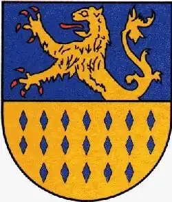 Blasonierung: „Geteilt von Blau und Gold, oben ein wachsender rotbewehrter und -bezungter goldener Löwe, bestreut mit goldenen Schindeln, unten 19 blaue Rauten, 7:7:5 gestellt.“