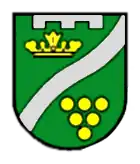 Blasonierung: Geviertes Wappen mit blau-weißem Wellenbalken. Feld 1: das Trierer Kreuz, Feld 2: goldene Krone auf grünem Grund, Feld 3: goldene Weinrebe mit Blatt auf grünem Grund, Feld 4: das Kurkölnische Kreuz.