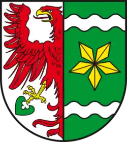 Blasonierung: „Gespalten von Silber und Grün; vorn ein goldbewehrter, halber roter Adler am Spalt mit ausgeschlagener roter Zunge, der Fang begleitet von einem grünen Seeblatt; hinten zwischen zwei silbernen Wellenbalken fünf sternförmig angeordnete, gespaltene goldene Rauten.“[10]