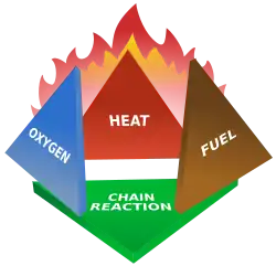 Die drei Faktoren des Verbrennungsdreieckes, für sich betrachtet, würden noch nicht zu einem Brand führen. Alle drei Faktoren müssen räumlich und zeitlich zusammentreffen, und es muss eine selbsterhaltende chemische Kettenreaktion entstehen, um den Verbrennungsprozess zu erhalten. In der englischsprachigen Ausbildungsliteratur der Feuerwehren ist daher das Verbrennungsdreieck auf ein dreidimensionales Modell, den sogenannten Brandtetraeder, erweitert worden.[2]