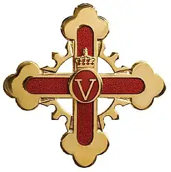 Das Ordenszeichen ist ein vergoldetes Kleeblattkreuz mit je einer Krone zwischen den Kreuzwinkeln. Auf den Kreuzarmen ist ein rotes Kreuz mit abgerundeten Enden zu sehen. Als Medaillon zeigt es das Signet Olavs V.: der Buchstabe O, darin ein V, von einer Krone überragt.