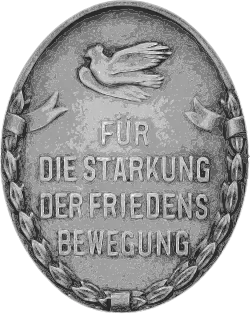 Die erste Form dieser Verdienstplakette entsprach einer ovalen silbernen Plakette mit einer Höhe von 34,5 mm. Sie zeigte in der oberen Hälfte eine fliegende Friedenstaube und darunter die Inschrift FÜR / DIE STÄRKUNG / DER FRIEDENS / BEWEGUNG. Umschlossen waren der Schriftzug und das Symbol von zwei unten gekreuzten Lorbeerzweigen, die nach 3/4 der Höhe mit einer wehenden Schleife abschlossen.