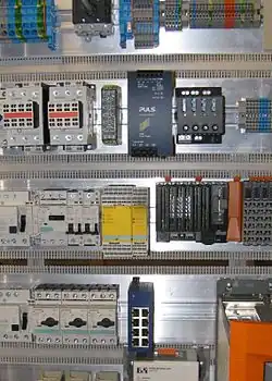 Komponenten sind Schalter, Taster, Schütze, Relais, SPS, Frequenzumrichter, Klemmen usw., die für eine Steuerung oder Regelung benötigt werden. Im allereinfachsten Fall sind dies nur Klemmen zur Signalverteilung.