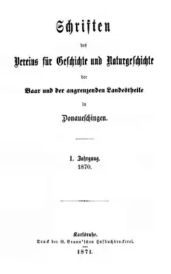 - ↑ Schriften des Vereins für Geschichte und Naturgeschichte der Baar und der Angrenzenden Landesteile in Donaueschingen, Erscheinungsverlauf: Heft 1 (1870/1871) bis Heft 21 (1940); Heft 22 (1950) bis Heft 26 (1966)