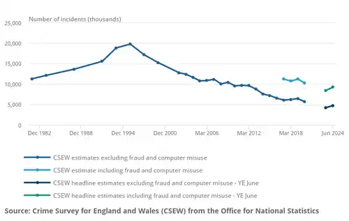 - ↑ Crime in England and Wales: year ending June 2019. Die Zahlen stammen aus Table 2a: Crime Survey for England and Wales (CSEW) incidence rates and numbers of incidents for year ending June 2019 and percentage change, abgerufen am 1. Dezember 2019.