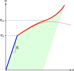 Verfestigung tritt auf, wenn metallische Werkstoffe über die Elastizitätsgrenze hinaus plastisch verformt werden. Bei einer mechanischen Zugbelastung macht sich das dadurch bemerkbar, dass die Spannung nach Überschreiten der Elastizitätsgrenze, d. h. während der plastischen Verformung weiter ansteigt. Dies lässt sich im Spannungs-Dehnungs-Diagramm, das mit einem Zugversuch ermittelt wird, erkennen (siehe Abbildung): Bis zu einer Spannung σe verhalten sich die meisten metallische Werkstoffe linear elastisch (blau gezeichnet) und werden bis dahin nur reversibel verformt. Bei höheren Spannungen (rot gezeichnet) kommt es zu einer plastischen, irreversiblen Verformung, was auch als Fließen bezeichnet wird. Hierbei verfestigt sich der Werkstoff und eine weitere Verformung ist nur durch nochmals erhöhte Spannungen möglich. Dieses Verhalten setzt sich fort, bis schlussendlich die Bruchspannung erreicht wird, bei der der Prüfkörper zerrissen wird (entspricht dem Ende der roten Kurve).