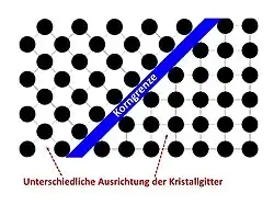 Als Korngrenzen werden die Flächen im Werkstoffgefüge bezeichnet, an denen Körner (Kristallite) aneinander stoßen. Deren Kristallgitter haben in der Regel unterschiedliche Ausrichtungen (siehe Abbildung), wodurch dort die Regelmäßigkeit der Atomordnung unterbrochen ist und Verspannungen im Gitter erzeugt werden, die die Bewegung der Versetzungen behindern. Je geringer die Korngröße ist, umso mehr Korngrenzen sind im Werkstoffgefüge vorhanden, die das Aufstauen der Versetzungen bewirken. Die daraus resultierende Verfestigung wird auch Kornfeinung oder Feinkornhärtung genannt. Eine mögliche Methode, um ein feinkörniges Werkstoffgefüge zu erzeugen, ist das so genannte Impfen der Metallschmelzen vor der Erstarrung: Durch Zusatzstoffe wird die heterogene Keimbildung gefördert und das Kornwachstum während der Abkühlung unterdrückt.[5] Auch die Art der Massivumformung und die Wahl der Legierungselemente haben einen Einfluss auf die Feinkörnigkeit. Ein wesentlicher Vorteil der Korngrenzenverfestigung besteht darin, dass die Festigkeit steigt, ohne dass die Duktilität abnimmt.