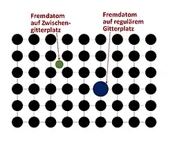 Metalle können im Kristallgitter Atome eines anderen chemischen Elements lösen. Das Phasendiagramm gibt die jeweilige Zusammensetzung und Temperaturbereiche an. Die Fremdatome befinden sich entweder auf Zwischengitterplätzen – dazu müssen sie ausreichend klein sein – oder sie ersetzen Atome des Basismetalls auf dessen Gitterplätzen (siehe Abbildung). Im erstgenannten Fall spricht man von Einlagerungsmischkristallen, andernfalls von Substitutionsmischkristallen. In beiden Fällen ist die regelmäßige Atomanordnung im Kristallgitter lokal gestört und es entstehen Gitterverspannungen. Da sie die Bewegung von Versetzungen erschweren, kommt eine Verfestigung zustande.
