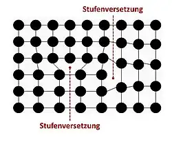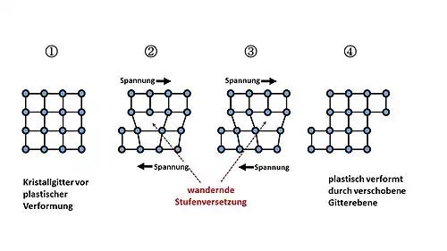 Bei Spannungen oberhalb der Elastizitätsgrenze werden Atomebenen im Kristall verschoben. Die Atome einer Gitterebene bewegen sich nicht alle gleichzeitig, sondern nacheinander. Dies wird durch immer vorhandene Versetzungen, d. h. linienförmige Gitterfehler ermöglicht, die eine hohe Beweglichkeit haben. Bei den so genannten Stufenversetzungen endet eine Gitterlinie irregulär innerhalb einer Gitterstruktur, die deshalb lokal verzerrt ist. Beim Einwirken einer äußeren Spannung wandert die Stufenversetzung um eine Gittereinheit und bewirkt so die Verschiebung der Atomebenen (siehe Abbildung). Die verschobenen Gitterebenen bleiben nach Wegnahme der mechanischen Spannungen in ihrer neuen Position. Außer den hier beschriebenen Stufenversetzungen können auch Schraubenversetzungen (mit schraubenförmig zusammenhängenden Gitterebenen) oder Mischformen beider Versetzungstypen an einer plastischen Verformung beteiligt sein.