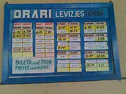 Der Bau des Normalspurnetzes nach dem Zweiten Weltkrieg diente vor allem dem Transport von Mineralien aus den Bergwerken zum Hafen von Durrës und in die weiterverarbeitenden Fabriken.[67] Die Gebirgslandschaft stellte große Herausforderungen an die Erbauer. Erst Mitte der 1980er Jahre erfolgte mit der Eröffnung der Bahnstrecke Podgorica–Shkodra der Anschluss ans internationale Bahnnetz.[68] Zustand und Ausbau waren bescheiden, die Strecken sind durchgängig eingleisig,[31] nicht elektrifiziert. Sitz der albanischen Eisenbahngesellschaft Hekurudha Shqiptare und Zentrum des Bahnnetzes ist Durrës.[56]