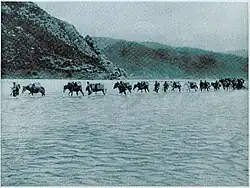 Im Gegensatz zum Rest von Europa wurde in Albanien keine Eisenbahn gebaut.[4] Aber es fehlte auch an Straßen – und die wenigen vorhandenen waren meist in so schlechtem Zustand, dass sie – insbesondere in der nassen Jahreszeit – kaum genutzt werden konnten.[5] Bis ins 20. Jahrhundert hinein beschränkte sich der Waren- und Personentransport zu Lande auf Tragtiere, die sich über Bergpfade und durch Sumpfgebiete kämpften. Eindrückliche Steinbogenbrücken im ganzen Land zeugen heute von den Karawanenrouten. Noch in den 1920er Jahren verließen Karawanen mit über 100 Pferden und Maultieren albanische Hafenstädte ins Landesinnere. Durch diese erschwerten Verhältnisse gab es zu dieser Zeit noch immer kaum Handel zwischen den einzelnen Regionen des Landes, die insbesondere mit Italien Handel trieben – dies war auch zu beobachten, wenn in einer Region Mangel herrschte und eine benachbarte Region Überfluss an diesen Waren hatte. Städte wie Shkodra waren im Winter vom Rest des Landes abgeschnitten.[6] Berichte von Reisenden zeugen nicht nur von den Schwierigkeiten, sondern auch von Gefahren durch Räuber und Behinderungen durch die osmanische Armee.[5][7][8]