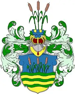 Das Wappen zeigte ursprünglich drei Rohrkolben über drei Wasserwellen.[3] Julius Vermehren änderte das Wappen von Rohrkolben auf Kornähren ab. Eine weitere Abänderung findet man Wappen Nachschlagewerken: In Silber aus grünem Boden wachsende drei Ähren, der Helm hat eine grün-silberne Binde, darauf die Ähren.[4]