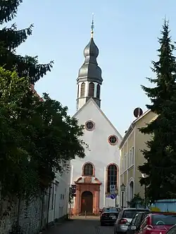 Das Hauptportal an der Nordseite zeigt eine korbbogige Öffnung zwischen verkröpften ionischen Pilastern. Oberhalb des Portals befindet sich ein verkürztes Rundbogenfenster. Als Glockenturm dient ein achtseitiger Dachreiter über dem Fassadengiebel. Er ist mit Schieferverkleidung, rundbogigen Schallöffnungen und einer profilierten Kuppelhaube versehen.