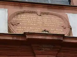 - „In den Jahren des Heils 1782 und 1783 unter Kurfürst Karl Theodor und seinen Oberbeamten Freiherr von Reybeld und H. von Tautphöus ward diese Kirche von reformierter Gemeinde dieser Stadt erbaut.“