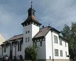 Nach dem Erwerb eines Baugrundes im Jahr 1904 wurde im Mai 1908 mit der Errichtung einer Kirche mit angegliedertem Pfarrhaus begonnen und diese am 13. September 1908 nach nur viermonatiger Bauzeit eingeweiht. Die Verbindung zwischen dem Kirchen- mit dem rechtwinklig anstoßenden Wohntrakt artikuliert ein eingezogener quadratischer Turm mit laternenbekröntem Pyramidendach. Der Kirchenflügel besitzt Strebepfeiler sowie gekuppelte Fenster, die lukarnenartig über die Dachtraufe fortgeführt sind, die Dachvorsprünge werden von vorkragenden Strebekonsolen getragen. Insgesamt ergibt sich dadurch ein abwechslungsreiches Baugefüge, das an die zeitgenössische Villenarchitektur erinnert.