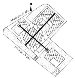 Der Anlage der Gebäude zeigt bei genauerem Hinschauen eine ausgewogene Planung: Das Gelände wird durch zwei Achsen bestimmt. Die eine Achse geht durch Kirche und Gemeindezentrum. Sie durchquert vier jeweils in der Mitte stehende Säulen, die Mitte zwei gegenüberliegender Seiten der Kirche und teilt wie die Kirche das Gemeindezentrum in zwei gleiche Hälften. Die andere Achse geht durch Glockenturm, Orgel, Altar und Kreuz direkt auf den Eingang des Pfarrhauses, wobei Glockenturm und Treppe vor dem Pfarrhaus gleich weit von der Außenwand der Kirche entfernt sind.