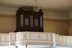 Neubau von Verschneider & Krempf. Erhalten ist nur das Gehäuse, das heutige Instrument stammt aus dem Jahr 1979 und wurde von Willy Meurer geschaffen. | ||