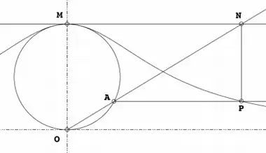 Die Kurve ist asymptotisch zu der Tangente an den Kreis im Punkt O.