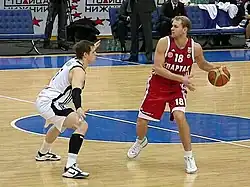 Darüber hinaus kann auch versucht werden zu verhindern, dass ein Angriffsspieler überhaupt den Ball bekommt. Einerseits kann dies durch Druck auf den Aufbauspieler oder durch Verstellen des Passweges (engl. overplay) erreicht werden. Ein Verteidiger steht so, dass er den Pass zwischen dem ballführenden Spieler und dem möglichen Empfänger behindert. Er verhindert entweder, dass der Pass überhaupt gespielt wird oder er spekuliert auf einen Ballgewinn (engl. steal), falls der Pass doch gespielt wird. Das Risiko hierbei ist, dass es bei Misserfolg zu sehr leichten Punkten für die gegnerische Mannschaft kommen kann. Deswegen wird diese Form meist versteckt gespielt, um dem Angreifer eine Falle zu stellen. Oft wird der Steal nicht durch den direkten Gegenspieler des ballführenden Spielers versucht.[11] Zusätzlich kann dem ballführenden Angreifer das Spielen eines Passes dadurch erschwert werden, dass man ihm eine Hand vor das Gesicht hält und so sein Sichtfeld entscheidend einschränkt.[12] Wird ein Pass gespielt, formiert sich die Verteidigung im Moment der Ballabgabe neu (nicht erst beim Fangen) und stellt sich auf den neuen ballführenden Spieler ein.