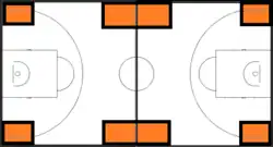 Im Gegensatz zu der Full-Court Press wird bei einer Half-Court Press (dt. Halbfeldpresse) nur in der eigenen Spielhälfte erhöhter Druck auf die angreifende Mannschaft ausgeübt. Dabei kann es sich um eine Mann-Mann-Verteidigung oder um eine Zonenverteidigung handeln. Es gibt in der Full-Court Press sowie in der Half-Court Press auch die Möglichkeit, eine so genannte Trapping-Defense einzusetzen (von engl. trap für dt. ‚Falle‘).[20] Dabei gibt es bestimmte Orte auf dem Basketballfeld (Trapping-Zones, siehe Abbildung), die sich dafür besonders eignen. Es wird versucht den ballführenden Spieler in diese Zonen zu drängen und durch „Doppeln“ einen Ballverlust (Turnover) zu forcieren.[21]