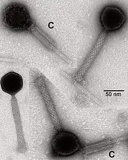 - ↑ a b Julianne H. Grose, Sherwood R. Casjens: Understanding the enormous diversity of bacteriophages: the tailed phages that infect the bacterial family Enterobacteriaceae. In: Virology, Band 468–470, November 2014, S. 421–443 (englisch); doi:10.1016/j.virol.2014.08.024, PMID 25240328, PMC 4301999 (freier Volltext).