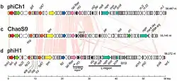Das Genom von ChaoS9 hat einen G+C-Gehalt von 65,3 % und vorhergesagt 85 kodierende Sequenzen (coding regions, coding sequences, CDS)[A. 2] es kodiert eine tRNA (für Arginin).[7] Das Genom von phiH (Variante phiH1) hat einen G+C-Gehalt von (je nach Autor) 63,7–64,0 % und vorhergesagt 97 CDS.[11]