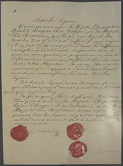 | Separatart. I | Die Abfolge der Art. III und IV – Maria Theresia wird vor Ludwig XV. genannt – ist nicht als Präzedenzfall für den Vorrang einer der beiden Majestäten zu verstehen. |