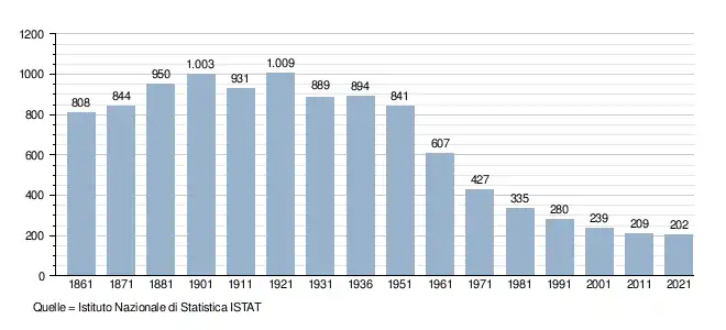 Die Bevölkerung hat seit der Volkszählung von 1921 bis heute um rund 80 % abgenommen.