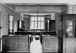 Wegen der unterschiedlichen Behörden sah Grässel vier Eingänge vor, von denen je einer in die getrennten Arbeitsamtsbereiche für Männer und Frauen im Erdgeschoss führte und die beiden anderen zu den Treppenhäusern, die den Zugang zu den Behörden mit weniger Publikumsverkehr in den oberen Stockwerken boten. Damit das Untergeschoss voll nutzbar war und um einen Höhenunterschied zum rückwärtigen Nachbargebäude auszugleichen, legte er den Fußboden des Erdgeschosses einen Meter über das Geländeniveau an der Frontseite, wodurch ein repräsentativer Haupteingang mit vorgelagerten Treppenstufen ermöglicht wurde. Die Raumhöhen wurden in den Stockwerken mit starkem Publikumsverkehr zwischen 3,50 und 4 m angesetzt, in den Obergeschossen mit Büros mit 3,30 m.[18] Ein Saal mit doppelter Raumhöhe erstreckte sich über zwei Geschosse und diente als Verhandlungsraum für das Gewerbegericht. Im Erdgeschoss lag eine Wohnung für den Hausmeister, während der Heizer eine kleine Dienstwohnung im vierten Obergeschoss hatte.[71]