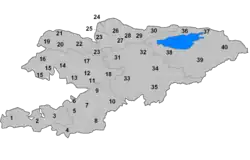 - 29 Städte (davon 12 Städte von regionaler Bedeutung und 17 Städte von rajonweiter Bedeutung; siehe Liste der Städte in Kirgisistan)