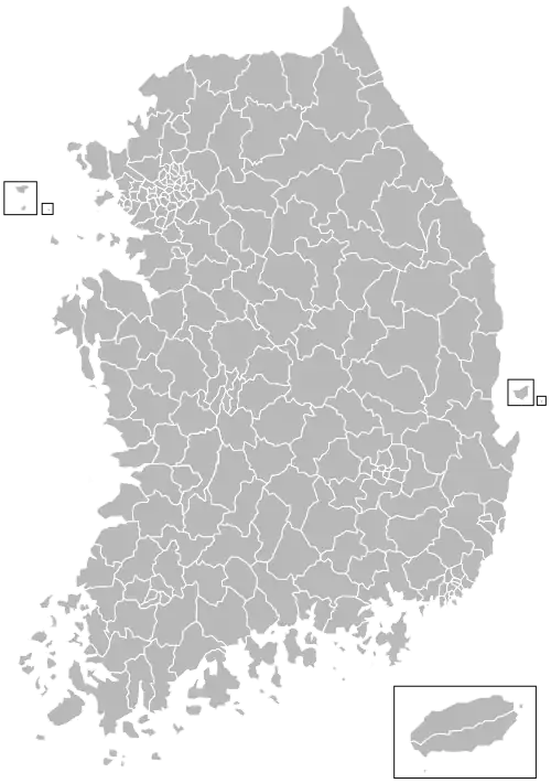 Südkorea ist politisch in eine besondere Stadt (Teukbyeolsi), eine besondere autonome Stadt (Teukbyeol-jachi-si), sechs Großstädte (Gwangyeoksi), acht Provinzen (Do) und eine besondere autonome Provinz (Teukbyeol-jachi-do) unterteilt. Diese sind wiederum in feinere Strukturen unterteilt.