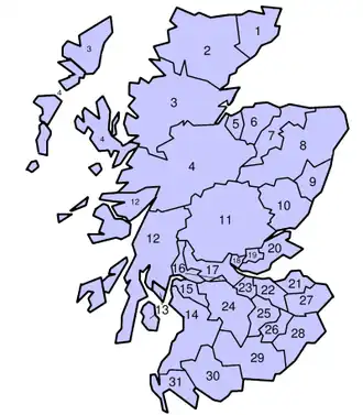 Die vier Städte Aberdeen, Dundee, Edinburgh und Glasgow bildeten separate „Stadtgrafschaften“ (engl. counties of cities). Diese erscheinen nicht auf der Karte.