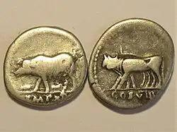 - ↑ Helmut Eisenlohr, Bernhard Pinsker, Helmut Schubert: Kehrseiten – Politische Ereignisse im Spiegel römischer Münzen. Taunusstein 1991, S. 37.