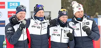 2 mit Ole Einar Bjørndalen, Tarjei Bø und Emil Hegle Svendsen 3 mit Ole Einar Bjørndalen, Henrik L’Abée-Lund und Emil Hegle Svendsen 4 mit Lars Helge Birkeland, Tarjei Bø und Johannes Thingnes Bø 5 mit Lars Helge Birkeland, Erlend Bjøntegaard und Johannes Thingnes Bø 6 mit Tiril Eckhoff, Marte Olsbu Røiseland und Johannes Thingnes Bø 7 mit Lars Helge Birkeland, Erlend Bjøntegaard und Johannes Dale 8 mit Johannes Dale, Tarjei Bø und Johannes Thingnes Bø 9 mit Sturla Holm Lægreid, Tarjei Bø und Johannes Thingnes Bø 10 mit Sivert Guttorm Bakken, Tarjei Bø und Johannes Thingnes Bø 11 mit Sivert Guttorm Bakken, Filip Fjeld Andersen und Sturla Holm Lægreid 12 mit Sivert Guttorm Bakken, Tiril Eckhoff und Ingrid Landmark Tandrevold 13 mit Sturla Holm Lægreid, Filip Fjeld Andersen und Johannes Thingnes Bø 14 mit Ingrid Landmark Tandrevold 15 mit Marte Olsbu Røiseland 16 mit Endre Strømsheim, Vebjørn Sørum und Johannes Dale 17 mit Endre Strømsheim, Tarjei Bø und Johannes Thingnes Bø 18 mit Sturla Holm Lægreid, Johannes Dale-Skjevdal und Tarjei Bø 19 mit Juni Arnekleiv |