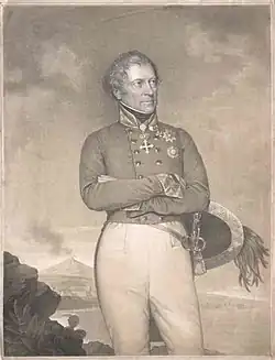 1813: Schild geviert mit Mittelschild. Im roten Mittelschild auf drei Felsenspitzen ein goldener, gekrönter Greif, welcher in der rechten Vorderklaue eine weiße Gartenlilie hält und oben rechts von einem silbernen Stern begleitet ist. 1 und 4 in Silber eine gekrönte, goldene, kreisförmige Schlange, welche sich in den Schwanz beißt und hinter welcher schrägrechts ein grüner Lorbeerzweig liegt. 2 und 3 in Schwarz ein schräglinks fließender silberner Strom, welcher oben von einem aufwachsenden, gekrönten, silbernen Adler und unten von einem silbernen Doppelkreuz begleitet ist.[2]