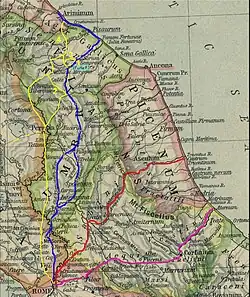 Wer diese riskante Strecke nach Smirra lieber meiden wollte, hatte bei Cantiano die Gelegenheit, auf eine alte Seitenstraße der Flaminia abzubiegen und sie als Querverbindung nach Apecchio zu nutzen. Dort stieß er auf eine alternative Amerina-Wegstrecke aus dem oberen Tibertal, die von Città di Castello (Tifernum Tiberinum) kommend über Sant’Angelo in Vado und Urbania nach Urbino (Urbinum) führte. Dieses gehörte ebenso wie die Bergstädte Cagli und Gubbio zur byzantinischen Pentapolis annonaria, wurde daher im 8. Jahrhundert zeitweilig auch Pentapolis genannt,[10] und bot sich dem Reisenden mit Kurs nach Nordosten als günstigster Ausgangspunkt für die Überquerung des Apennins unter Umgehung der Furlo-Schlucht an.[11]