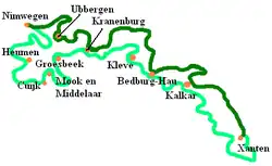 Dabei ist ihr Streckenverlauf geteilt: Die nördliche Route verläuft von Xanten bis Nijmegen entlang des Rheins und beträgt 98 km, die 159 km lange Südroute entfernt sich auf ihrem Verlauf von Nijmegen nach Xanten vom Rhein, um stattdessen durch Städte wie Kleve oder das niederländische Heumen zu führen.